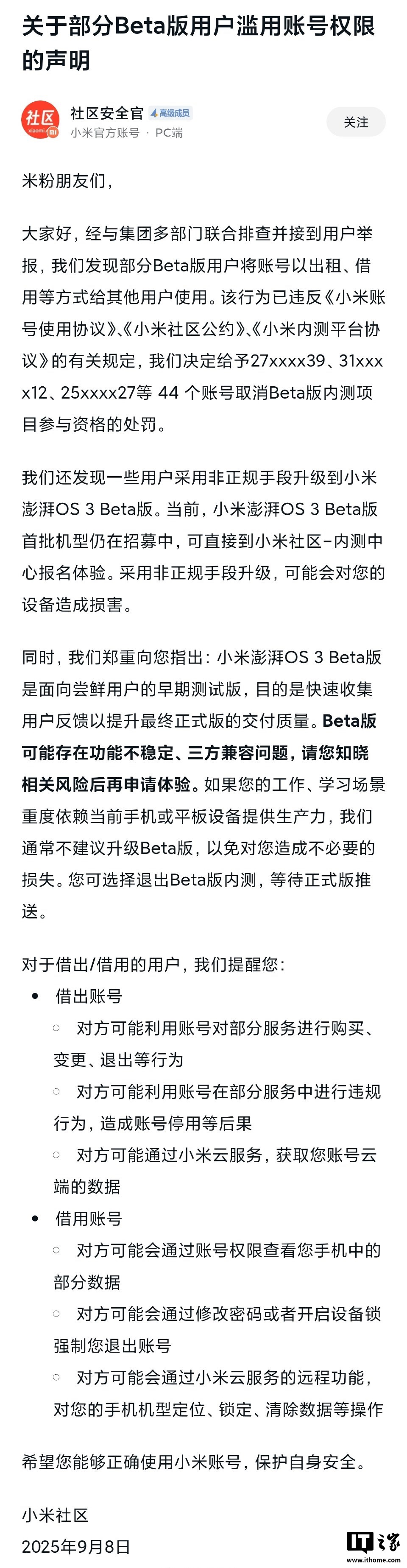 IT之家 9 月 9 日消息,小米社区安全官发文,称经与集团多部门联合排查并接到用户举报,核实部分 Beta 版用户将账号以出租、借用等方式给其他用户使用。相应行为违反《小米账号使用协议》、《小米社区公约》、《小米内测平台协议》的有关规定,因此决定给予 27xxxx39、31xxxx12、25xxxx27 等 44 个账号取消 Beta 版内测项目参与资格的处罚。