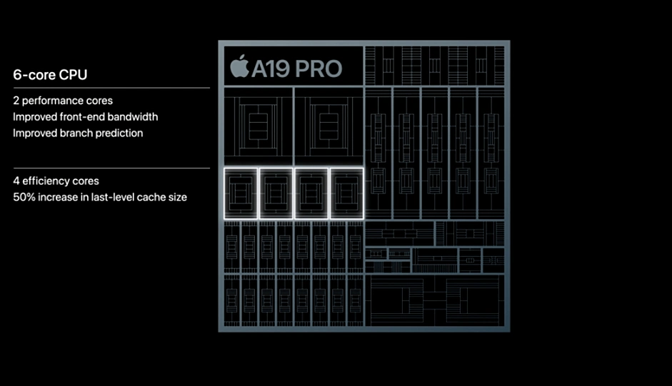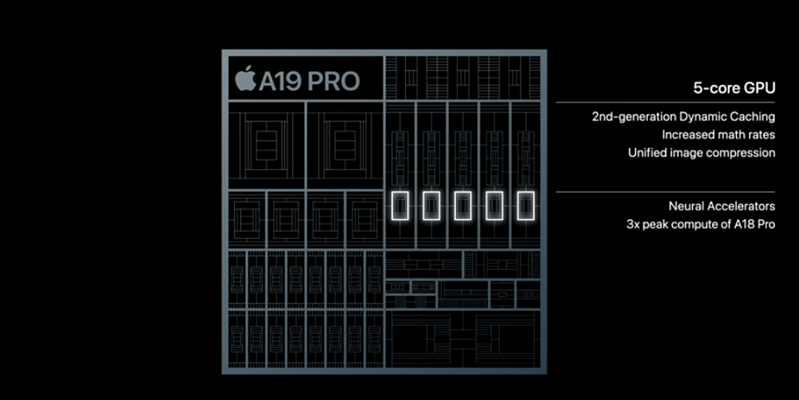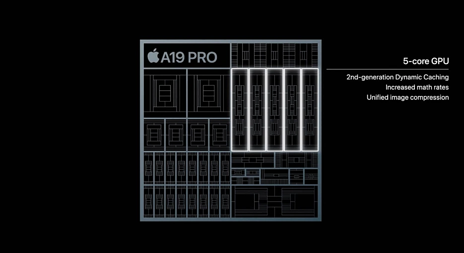 IT之家从发布会获悉,A19 Pro 芯片配有 6 核 CPU + 5 核 GPU,宣称比 A19 更快、更高效。GPU 通过第二代动态缓存更新,数学性能翻倍,并引入新的统一图像压缩技术。
