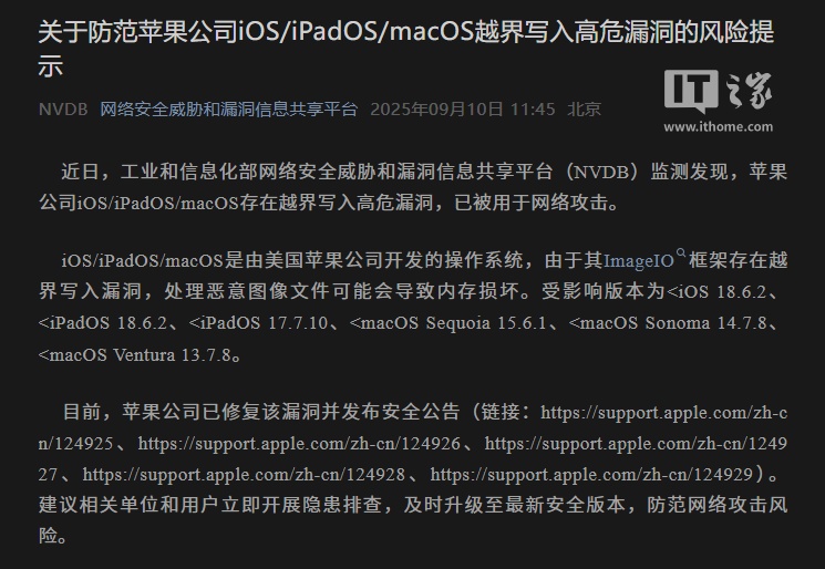 IT之家 9 月 10 日消息,据“网络安全威胁和漏洞信息共享平台”微信公众号消息,近日,工业和信息化部网络安全威胁和漏洞信息共享平台(NVDB)监测发现,苹果公司 iOS / iPadOS / macOS 存在越界写入高危漏洞,已被用于网络攻击。