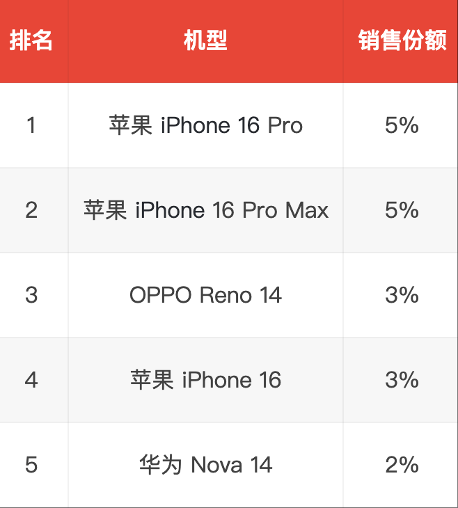 IT之家 9 月 11 日消息,市场调查机构 CounterPoint Research 昨日(9 月 10 日)发布博文,报告了 2025 年 6 月中国市场最畅销 5 款智能手机机型,其中 iPhone 16 Pro 和 iPhone 16 Pro Max 均以 5% 份额,位居榜首。