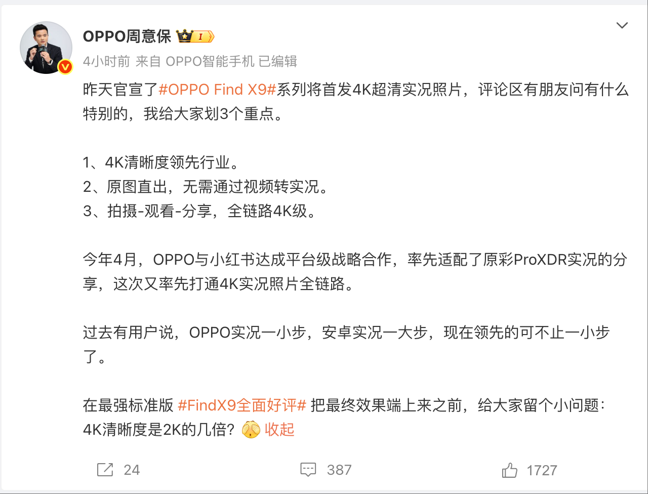 此外,OPPO Find X9另一个值得关注的功能是联合小红书首发4K超清实况照片,官方称原图直出,无需通过视频转实况。拍摄-观看-分享,全链路4K级。