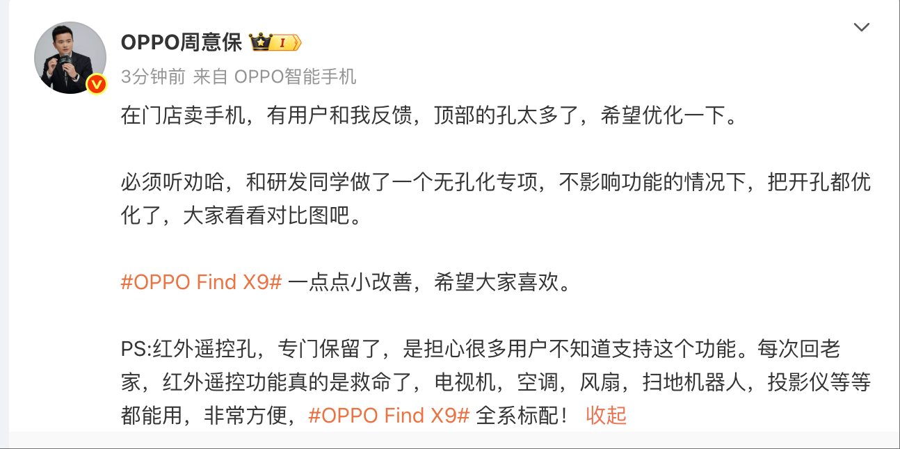 凤凰网科技讯 9月11日,OPPO find系列产品负责人周意保发文,针对用户反应OPPO Find X8顶部开孔多的痛点,新一代旗舰机型OPPO Find X9仅保留了一个孔,相比于上代减少3个。