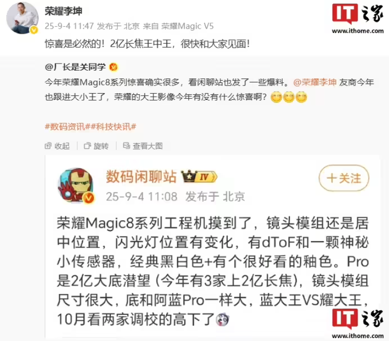 除了这些,于荣耀 Magic 8 系列,此前也有一些消息曝光。博主 @数码闲聊站 曾表示,荣耀 Magic 8 工程机镜头模组还是居中设计,闪光灯位置有变化,配备 dToF 和一颗神秘小传感器,经典黑白色 + 有个很好看的釉色。此外,他还透露 Pro 是 2 亿大底潜望(今年有 3 家上 2 亿长焦),镜头模组尺寸很大,底和阿蓝 Pro(此处预计指 vivo 新机)一样大。