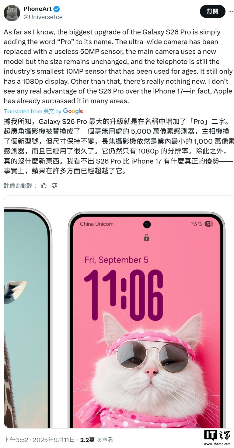 IT之家 9 月 11 日消息,消息人士 PhoneArt 今天在 X 平台透露,三星 Galaxy S26 Pro 手机的升级幅度有限,且没有配备全新潜望长焦镜头。