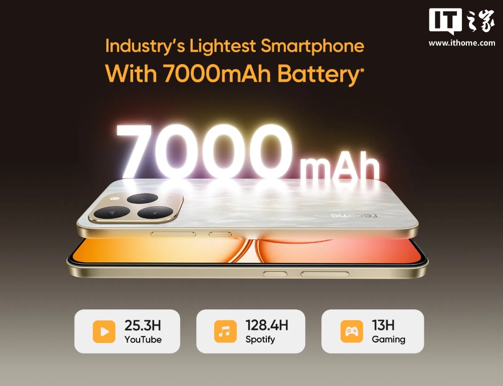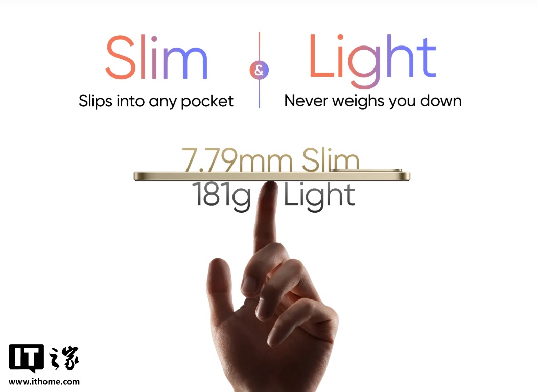 这款手机采用 7.79mm 超薄设计,配以 6.57” 大 R 角小直屏,重量为 181 克,并拥有 7000mAh“泰坦电池”,配有联发科天玑 6400 芯片。