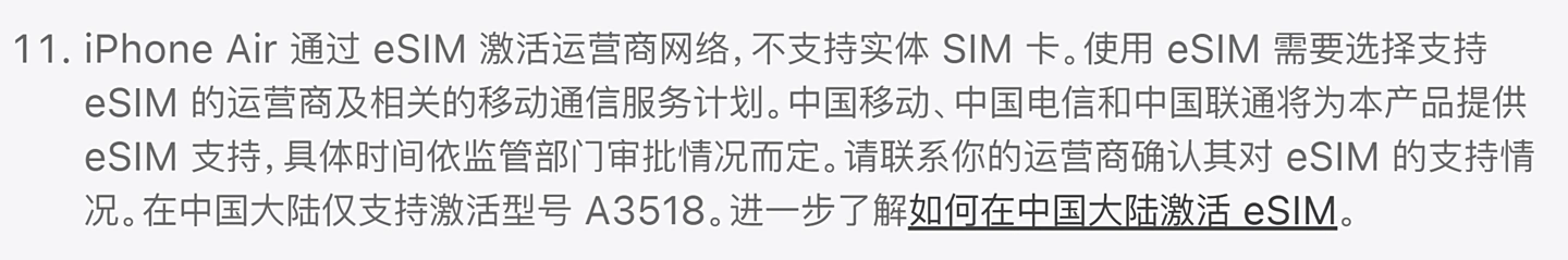 文章来源于互联网:IT之家-苹果官方确认:中国移动、电信、联通将为 iPhone Air 提供 eSIM 支持