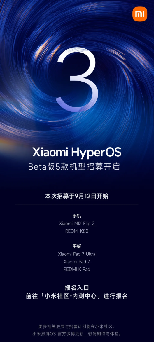 IT之家 9 月 12 日消息,小米今日宣布澎湃 OS 3 Beta 版 5 款机型已开启招募,这也是其第二批招募机型,用户可以前往小米社区-内测中心报名。