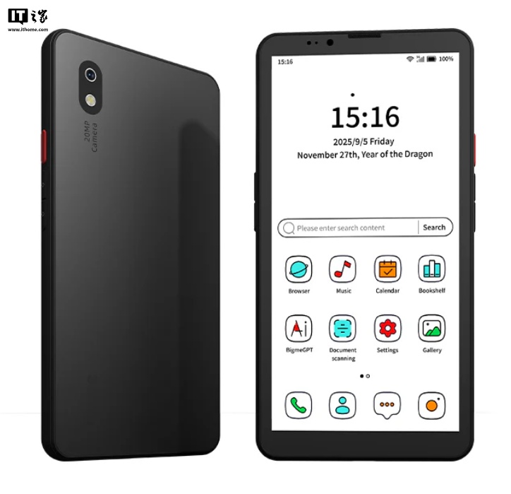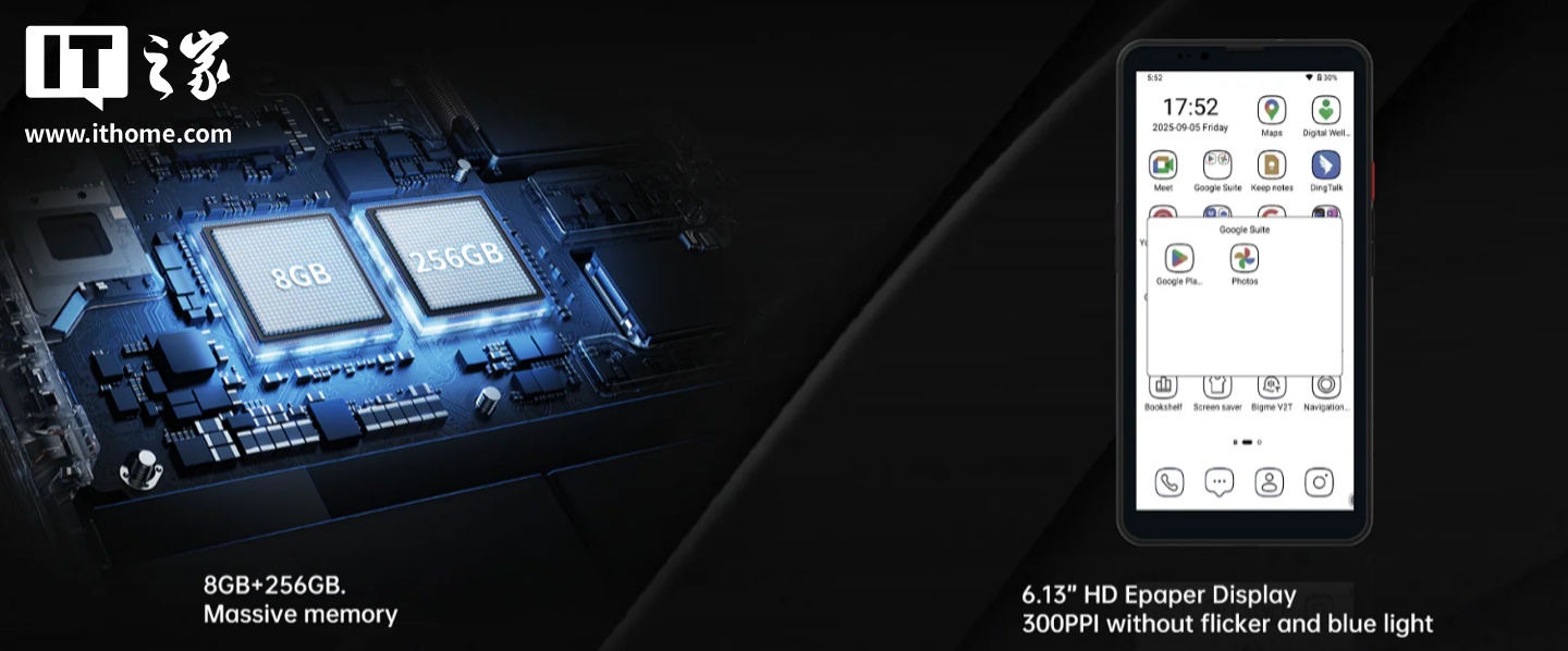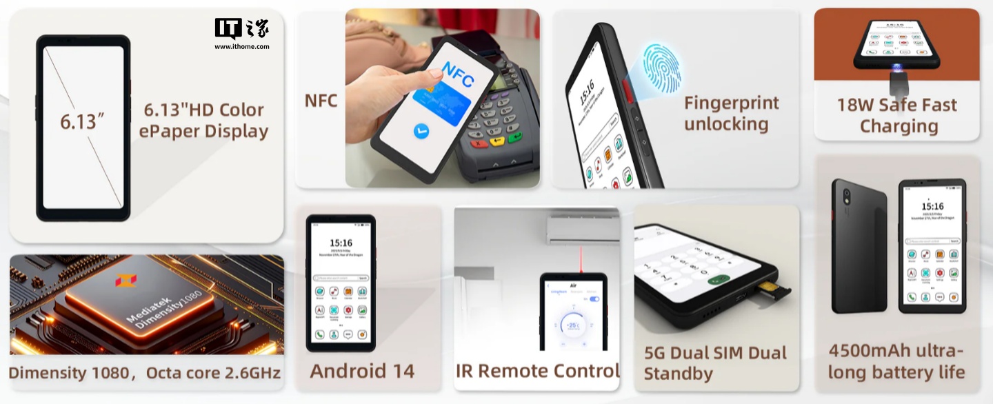 该手机搭载 6.13 英寸彩色墨水屏,支持 300PPI 高清显示、SSS 级快刷 + 自动清残影技术;配有天玑 1080 处理器、8GB + 256GB 存储。