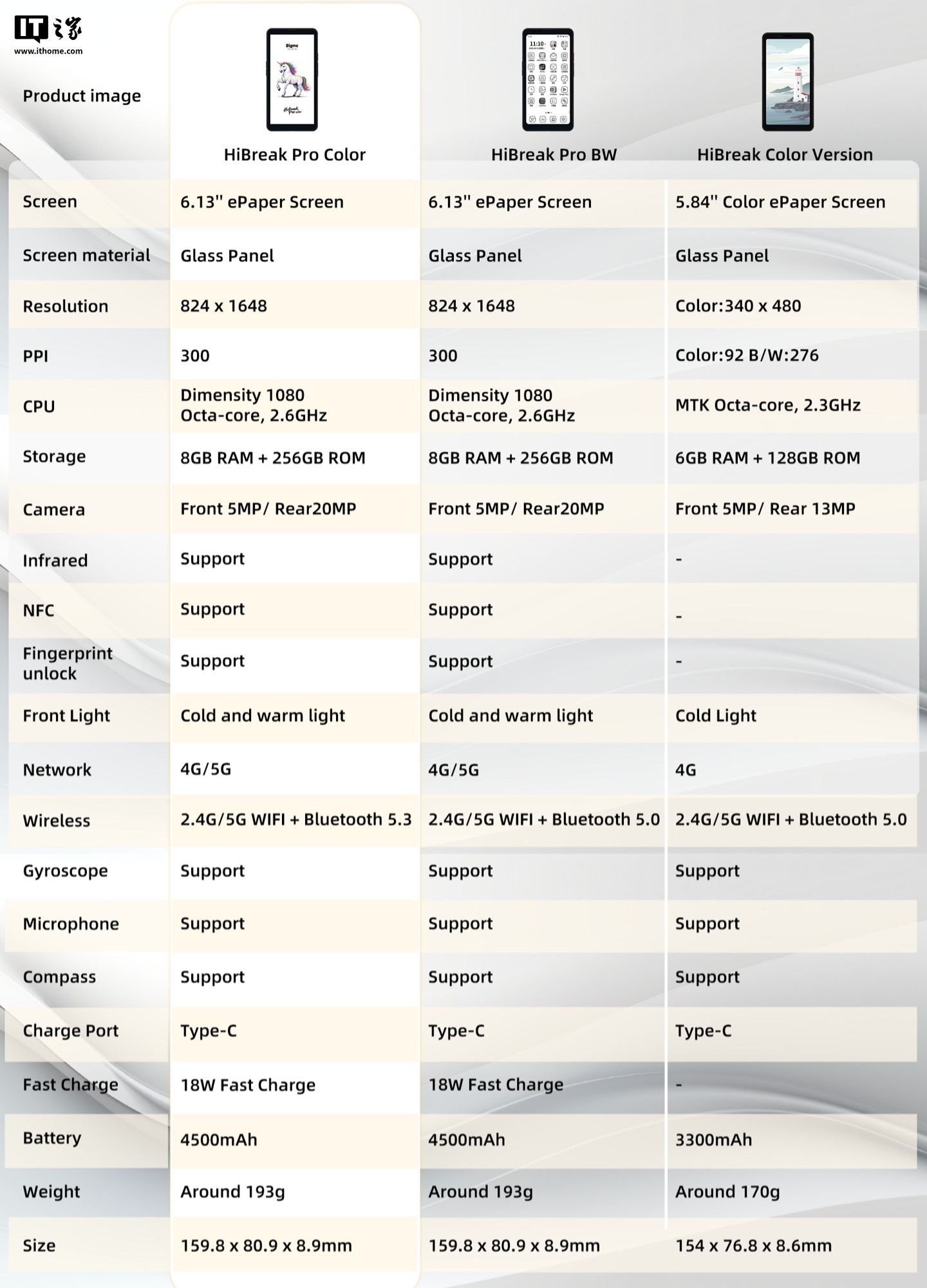 大我 HiBreak Pro Color 护眼彩墨屏手机重量约 193g,厚度 8.9mm,预售价 377.99 欧元(现汇率约合 3154 元人民币),IT之家附参数表如下: