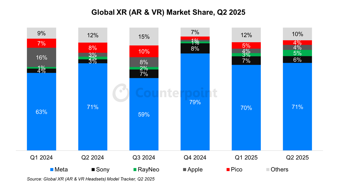 IT之家 9 月 13 日消息,市场调查机构 CounterPoint Research 昨日(9 月 12 日)发布博文,报告称 2025 年第 2 季度全球扩展现实(XR,含虚拟现实 VR 和增强现实 AR)头显市场,Meta 凭借着 71% 份额位居榜首。