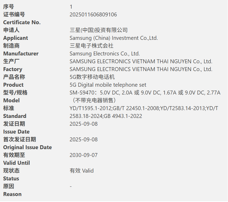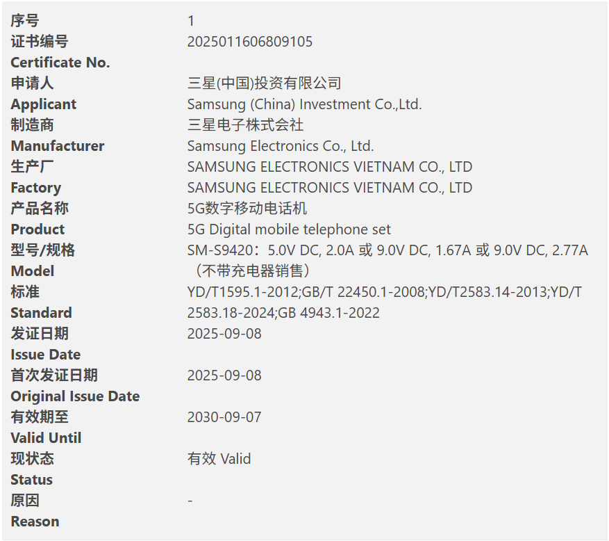 3C 认证页面显示支持 10V / 4.5A 或 15V / 3A,这与 Galaxy S25 Ultra 完全相同,显示依然支持 45W 充电。IT之家附上相关截图如下: