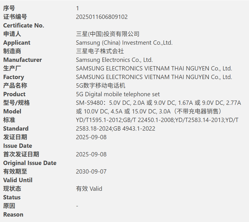 此外型号为 SM-S9480 的三星手机通过 3C 认证,根据此前 GSMA IMEI 数据库信息,可以确认该型号为国行版 Galaxy S26 Ultra。