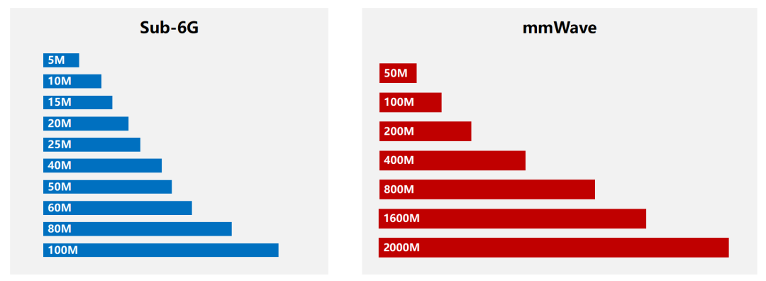 这个频段的资源更加丰富。Sub-6G 频段一般就是 40MHz 或 100MHz,毫米波直接 100MHz 起步,多的可以给到 800MHz 甚至 2000MHz。