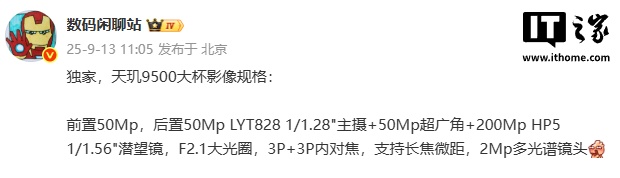 IT之家 9 月 13 日消息,博主 @数码闲聊站 今日曝光某厂天玑 9500 大杯手机影像规格,预计为 OPPO Find X9 Pro。