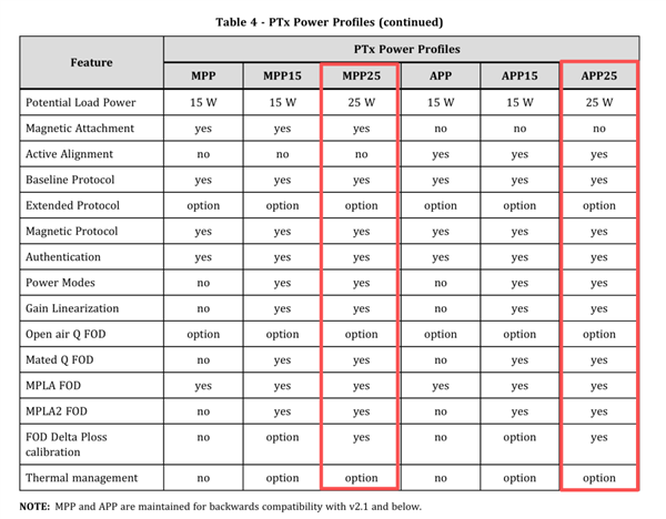 这回 Qi2 25W 支持了 25W 的无线充电功率,它背后对应着 Qi2.2 标准中两个协议的升级, 一个是针对手机与无线充电器磁吸对准的 MPP ( Magnetic Power Profile ),还有一个是针对车载场景,主动调整线圈位置来对其的 APP ( Active Alignment Profile ),从 Qi2 的 15W 最大输出变成了 25W 。