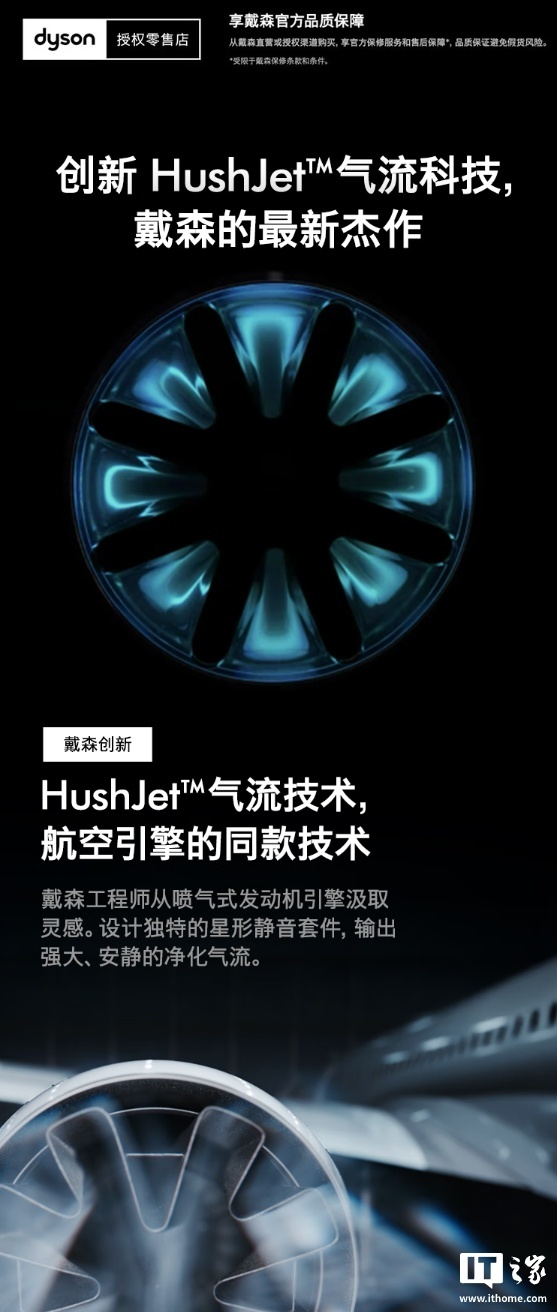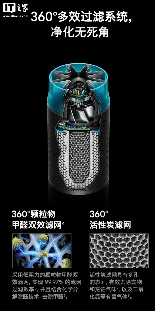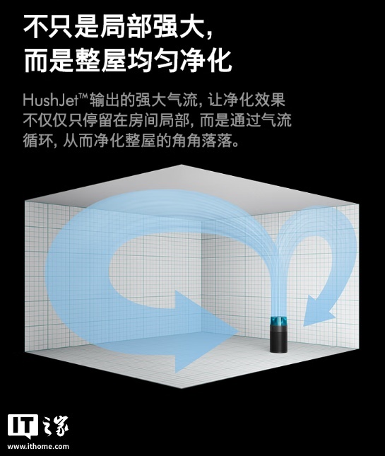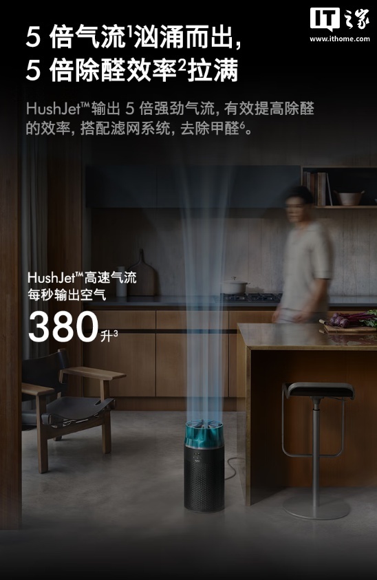这款产品灵感源自喷气式发动机引擎,其机身顶部的星形静音套件搭载 HushJet 气流技术,每秒可输出 380 升空气,通过气流循环净化整屋,机身内置有 360° 颗粒物甲醛双效滤网、活性炭滤网,可过滤 99.99% H1N1、猫杯状、EV71 病毒等。