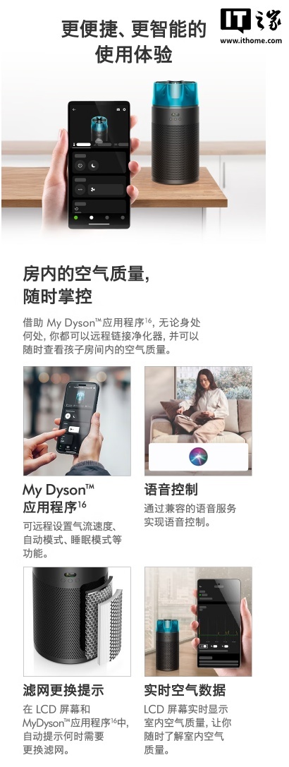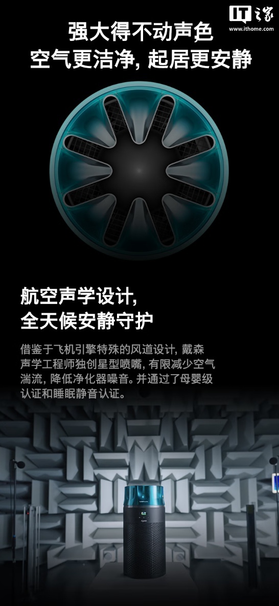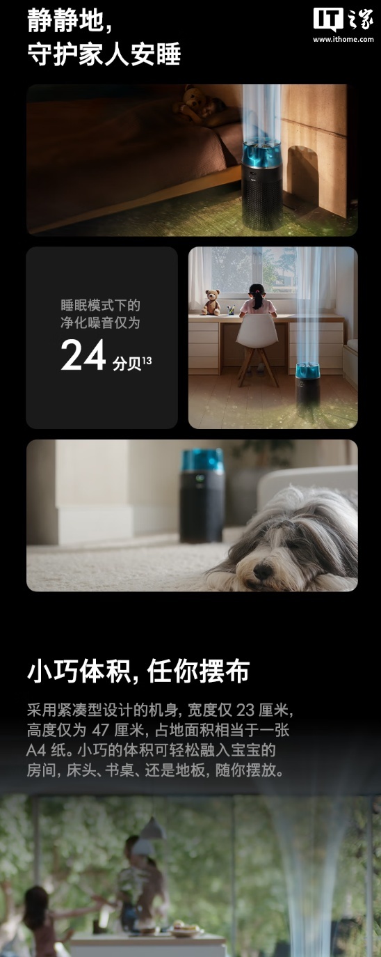 这款空气净化器还借鉴了飞机引擎的特殊风道设计,可有效减少空气湍流,睡眠模式下净化噪音仅为 24 分贝,通过了母婴级认证,其宽度、高度分别为 23、47 厘米,占地面积相当于一张 A4 纸,可放在床头、书桌、地板等场景。