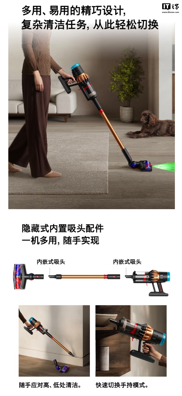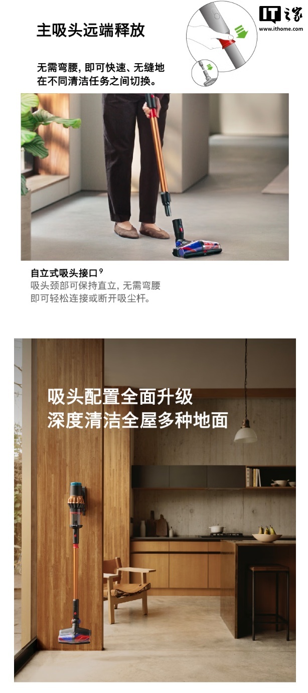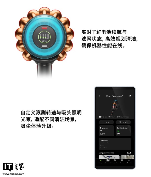 这款吸尘器还支持智能互联,可使用手机 App 实时了解电池续航和 HEPA 滤网状态,并可自定义滚刷转速与吸头照明光束,适配不同清洁场景。