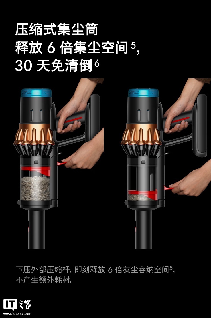 人性化设计方面,这款吸尘器搭载压缩式集尘筒,只需要下压外部压缩杆即可释放 6 倍灰尘容纳空间,不产生额外耗材,还可减少毛发缠绕现象;本体自带 2+3 款吸头配件,其中带有全新自适应智能吸头,采用锥形滚刷设计,可深入清洁地毯、吸除长发。