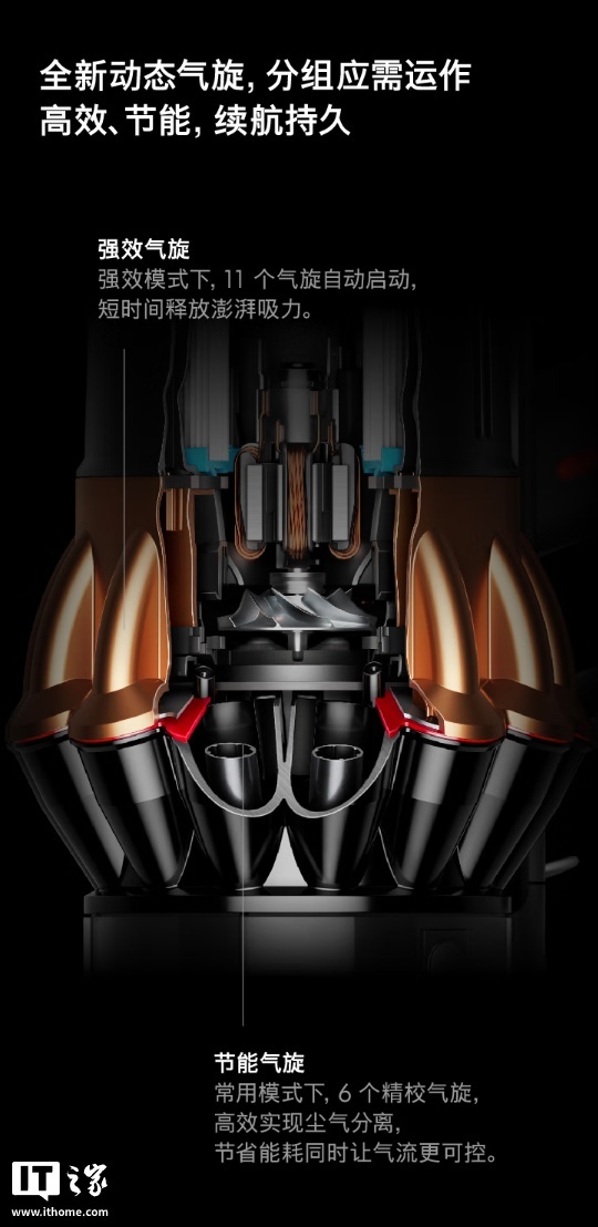 这款吸尘器搭载全新的 Hyperdymium 900W 马达,采用 180° 逆转布局,可输出 315W 的澎湃吸力,机身布局经过优化,尺寸缩减 25 毫米,吸力提升 12.5%,拥有全新动态气旋,可自动调配 11 个气旋组件,短时间内释放更大吸力。