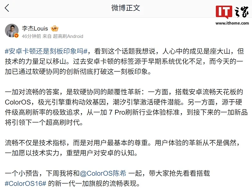 文章来源于互联网:IT之家-一加李杰:过去安卓卡顿的标签源于早期系统优化不足,而今天的一加已通过软硬协同创新彻底打破这一刻板印象