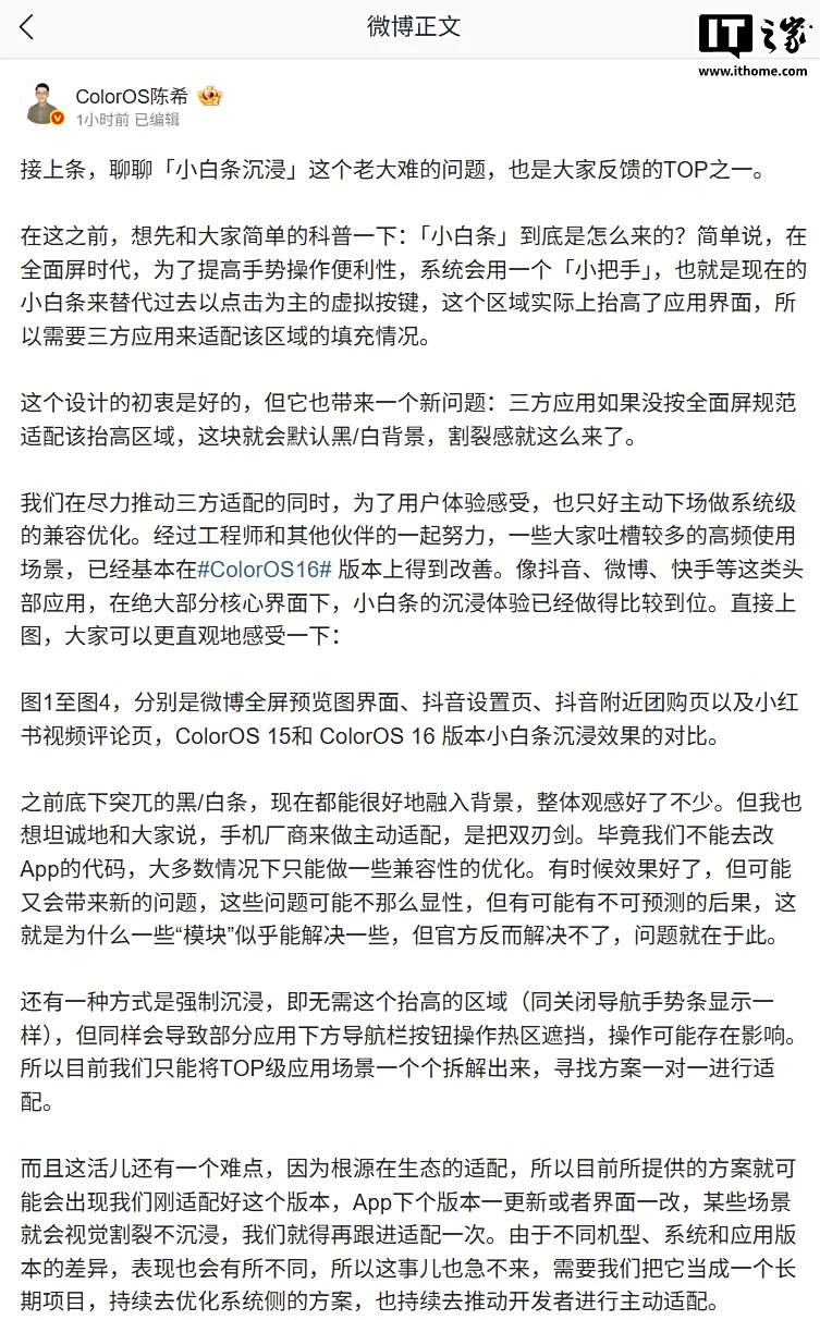 陈希透露,在 ColorOS 16 中,微博、抖音、快手等核心应用已经做到了“小白条沉浸体验”,相比之前底下突兀的黑 / 白条,整体观感好不少,但这些应用也存在手机厂商主动做适配的“双刃剑”问题,只能将每个 TOP 级应用场景拆解出来,寻找方案一对一适配。