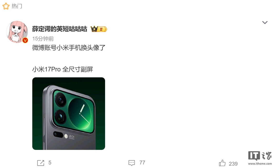 文章来源于互联网:凤凰网-小米手机官博头像意外泄露新机背屏,预计为17 Pro系列