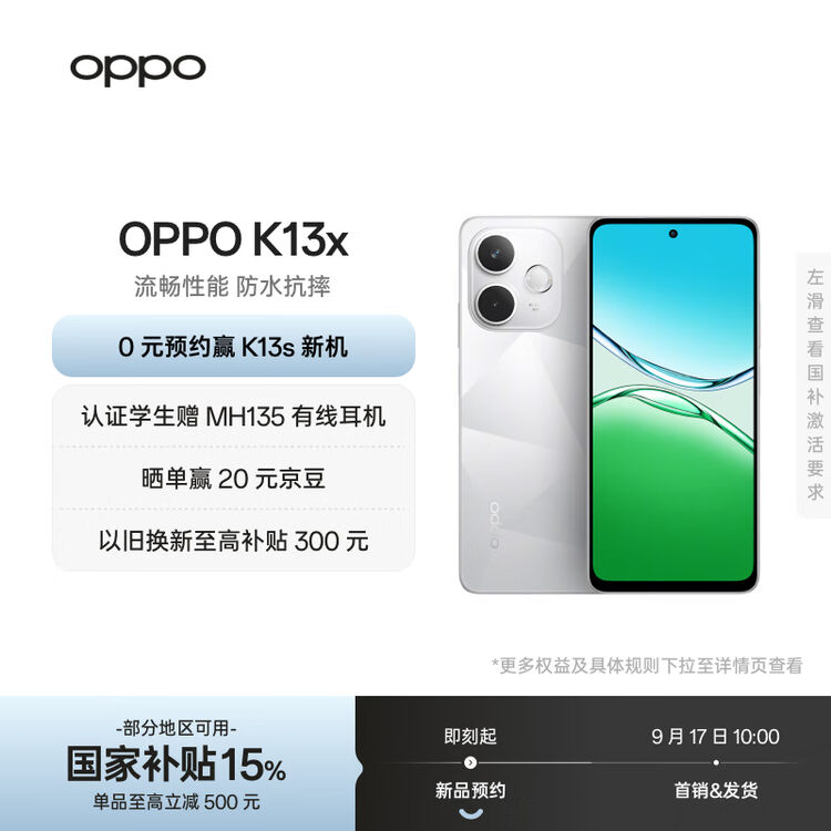 京东 OPPO K13x 全新千元性能神机 信号穿墙王 天玑 6300 IP69 防尘防水 国家补贴 新款 5G 手机 8GB+128GB 钻白 待发布直达链接