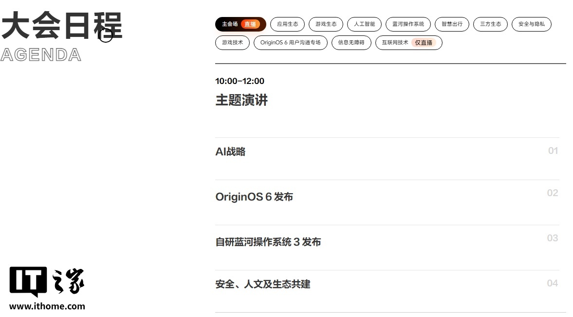 根据会议日程,vivo 将率先公布其“AI 战略”,并推出全新的 OriginOS 6、蓝河操作系统 BlueOS 3.0。后续,vivo 还将公布其“安全、人文及生态共建”计划。