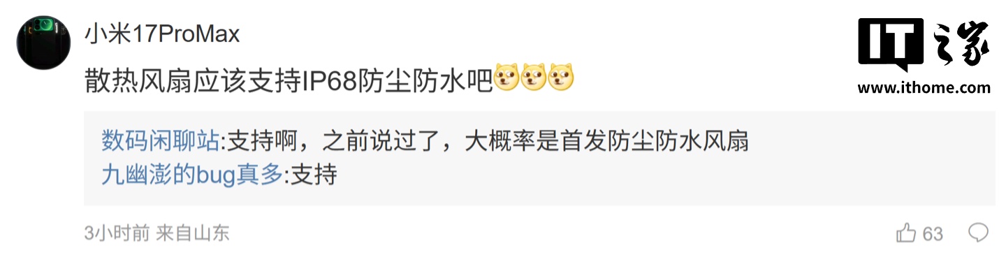 后续有网友在评论区询问:“散热风扇应该支持 IP68 防尘防水吧