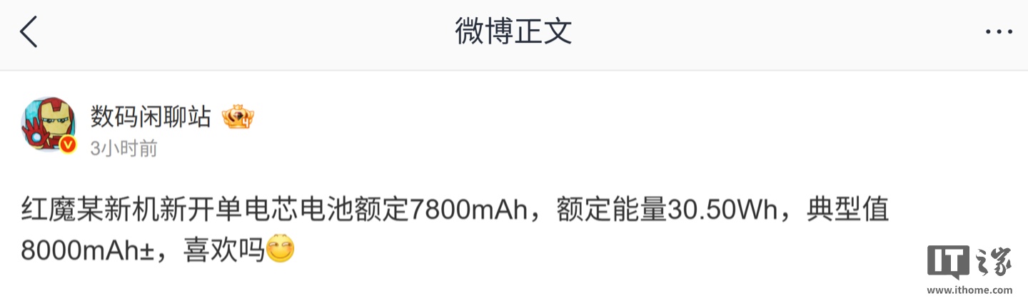 文章来源于互联网:IT之家-消息称红魔某新机新开单电芯电池额定容量 7800mAh,典型值 8000mAh±