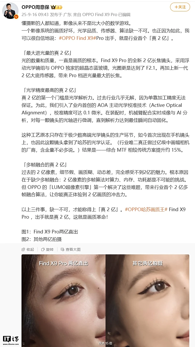 文章来源于互联网:IT之家-OPPO 周意保:Find X9 Pro 将成行业首个“真 2 亿”手机