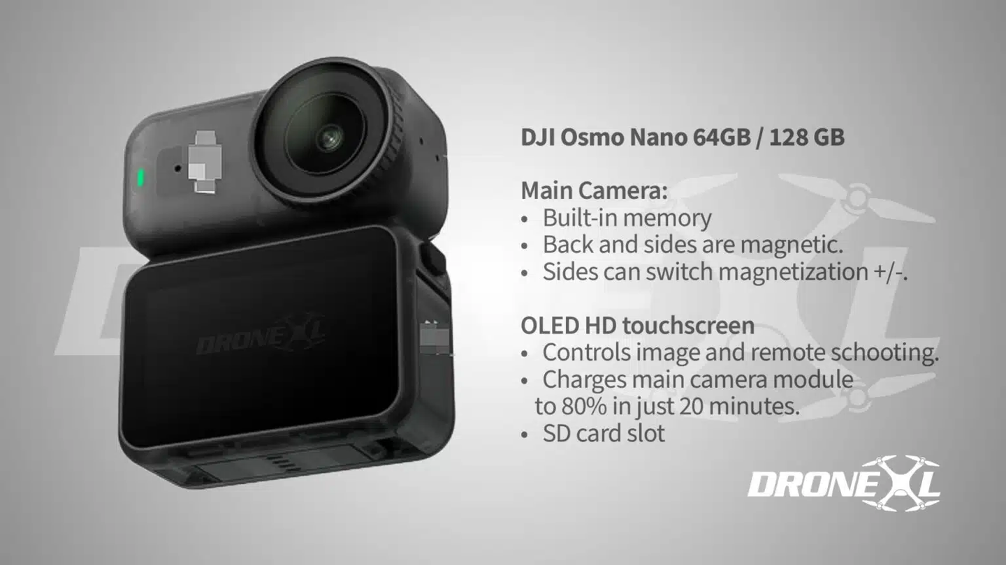 根据此前曝光的信息,这款新品预计为 Osmo Nano 运动相机,延续模块化磁吸设计,可磁性连接屏幕等配件,机身呈药丸状,定位为已停产 DJI Action 2 的继任者。