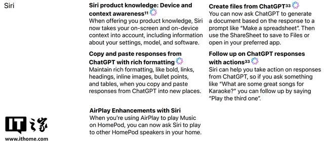 其次,苹果强化了 Siri 接入 ChatGPT 体验。在用户从 ChatGPT 复制回答后,Siri 现在可以保留原有的富文本格式,包括加粗、链接、标题、内嵌图片、项目符号以及表格。这让跨应用迁移内容更高效,减少了格式重排的麻烦。