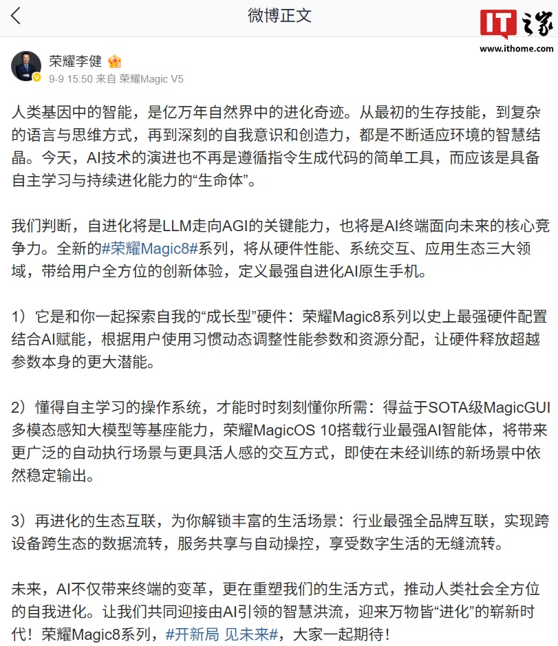 据IT之家此前报道,荣耀 CEO 李健在 9 月 9 日发文预热荣耀 Magic8 系列,他表示,新机是最强自进化 AI 原生手机,以史上最强硬件配置结合 AI 赋能,根据用户使用习惯动态调整性能参数和资源分配,让硬件释放超越参数本身的更大潜能。