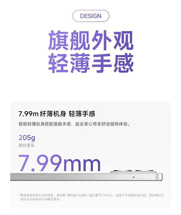 据小米介绍,这款手机的机身采用轻薄设计,最薄处为 7.99mm,重量为 205g,拥有云雾白、青柠绿、暮光紫、星岩黑四种配色,其屏幕采用水滴屏设计,尺寸为 6.9″,刷新率可达 120Hz,HBM 亮度可达 810 尼特,支持湿手触控 2.0。