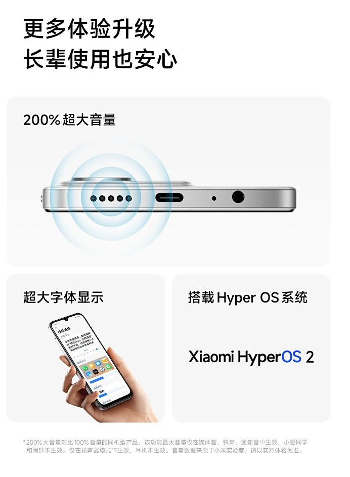 此外,这款手机搭载澎湃 HyperOS 2 系统,支持超大字体显示等适老化功能,扬声器支持 200% 超大音量,方便老人操作,还拥有 3.5mm 耳机接口,可使用有线耳机听音乐等。