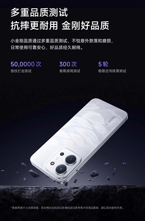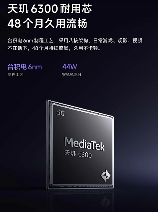 性能方面,这款手机搭载天玑 6300 芯片,基于台积电 6nm 制程工艺制造,号称可“48 个月持续流畅”,内置 1300 万像素后摄,支持 HDR 模式,适应各种拍摄场景,配有纯石墨 6000mAh 电池,续航号称可达“1.9 天”。