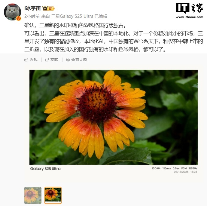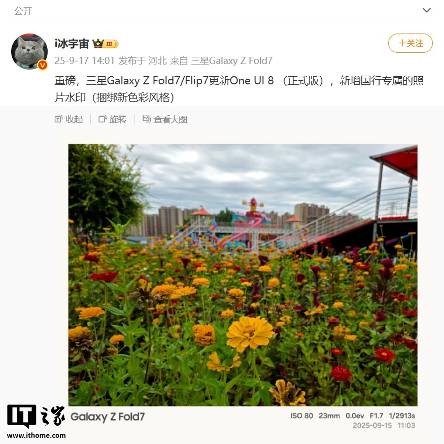 IT之家 9 月 17 日消息,据博主 @i冰宇宙 今天在微博的发文,三星已为国行 Galaxy Z Fold 7 / Flip 7 折叠屏手机推送了 One UI 8 正式版系统,新增了国行机型独享的相机水印。