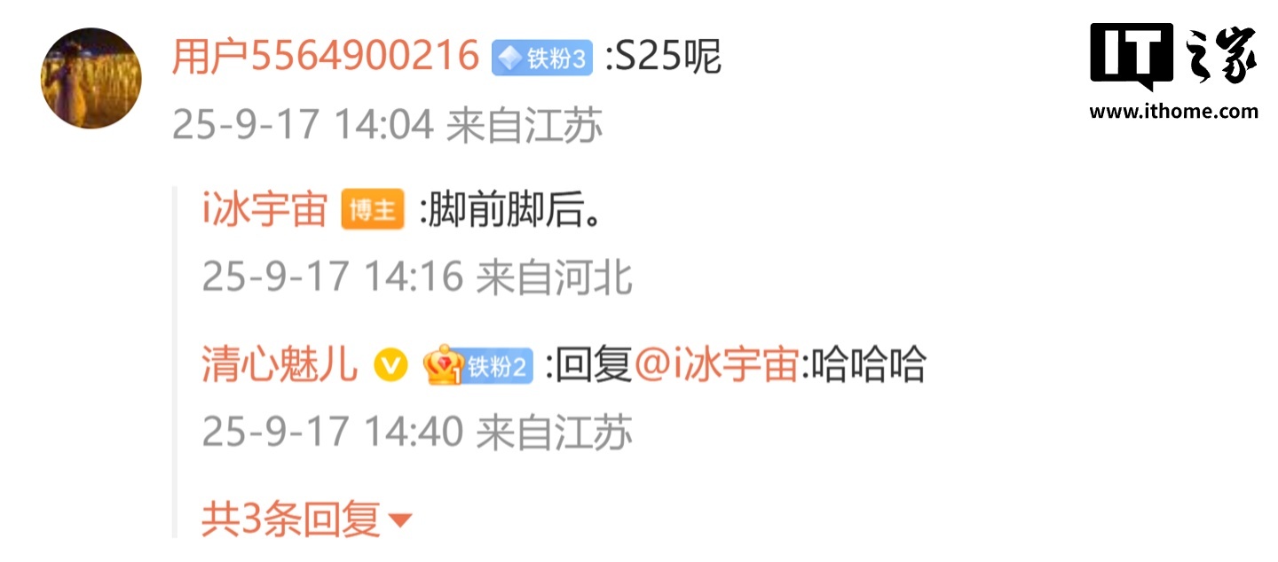 后续有用户在评论区询问:“S25 呢”,博主回复道:“脚前脚后”;另一名用户则询问道:“国行来了?”,博主则回复道:“是的”。