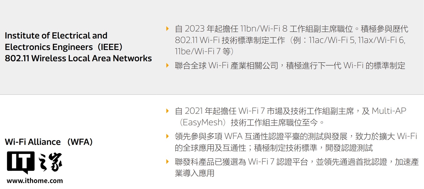 自 2023 年起,联发科即担任 11bn/Wi-Fi 8 工作组副主席职位,积极参与历代技术标准制定工作;同时,联合全球 Wi-Fi 产业相关公司,进行下一代 Wi-Fi 的标准制定。IT之家附上联发科官方宣传资料截图如下: