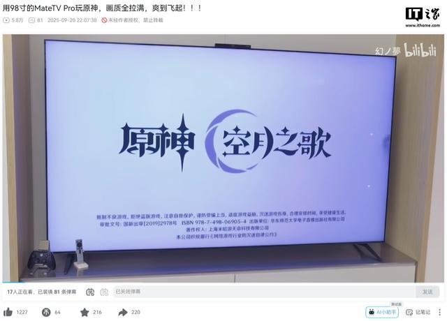 IT之家注意到,有博主分享了自己使用华为智慧屏 MateTV Pro 安装、游玩米哈游《原神》的视频,并在视频的标题直言:“用 98 寸的 MateTV Pro 玩原神,画质全拉满,爽到飞起!!!”