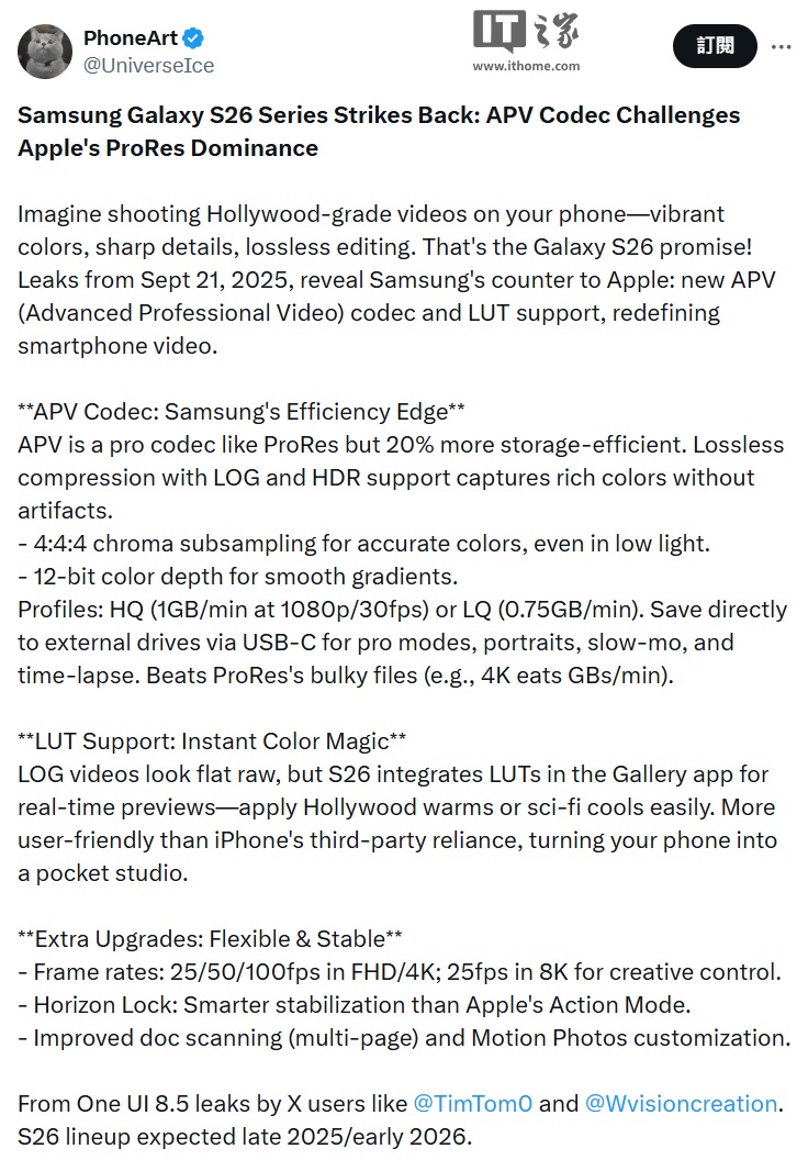 IT之家 9 月 22 日消息,消息人士 UniverseIce 今天在 X 平台透露,三星 Galaxy S26 系列将成为首个支持 APV 编码器的智能手机对标苹果的 ProRes 格式