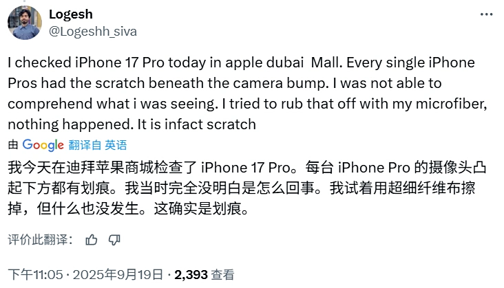 其中一位迪拜消费者在 X 平台表示,他在线下零售店看到的每一台 iPhone 17 Pro 系列手机在镜头模组下方都有划痕,他“完全无法理解他看到的是什么”。