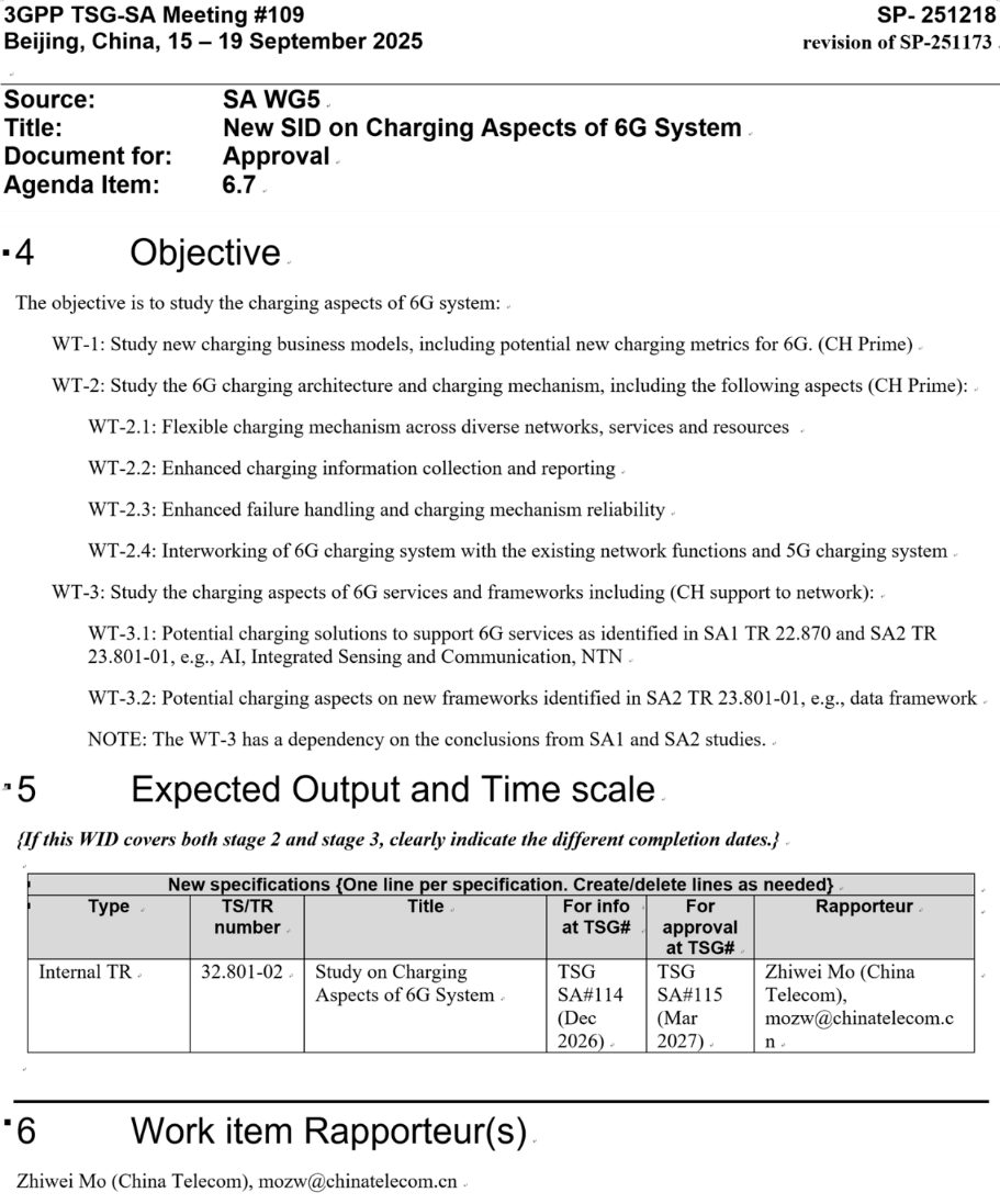 中国电信表示,作为 3GPP 首个 6G 计费项目,该立项将面向 6G 新型服务设计新的计费模式,包括探索 6G 新型计费商业模式与计费量纲,研究跨网络、跨服务和跨资源的 6G 计费架构与机制,并为 AI、通感、天地一体等 6G 关键服务提供可行的计费方案。
