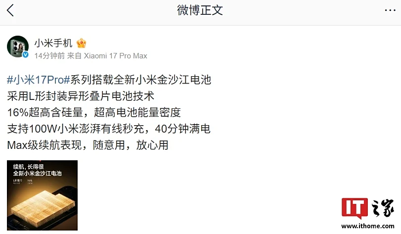 文章来源于互联网:IT之家-雷军:小米 17 Pro 系列手机搭载全新金沙江电池,首次采用 L 形封装异形叠片电池技术