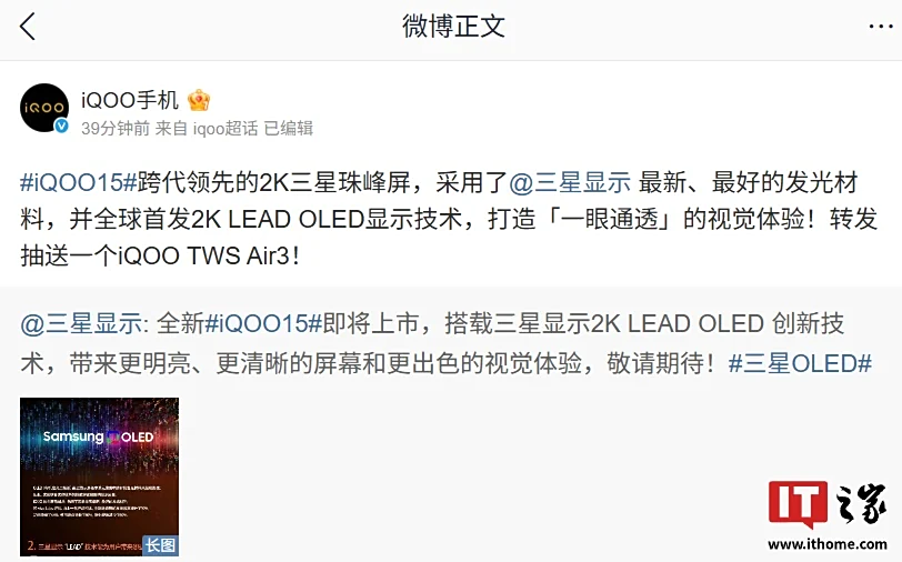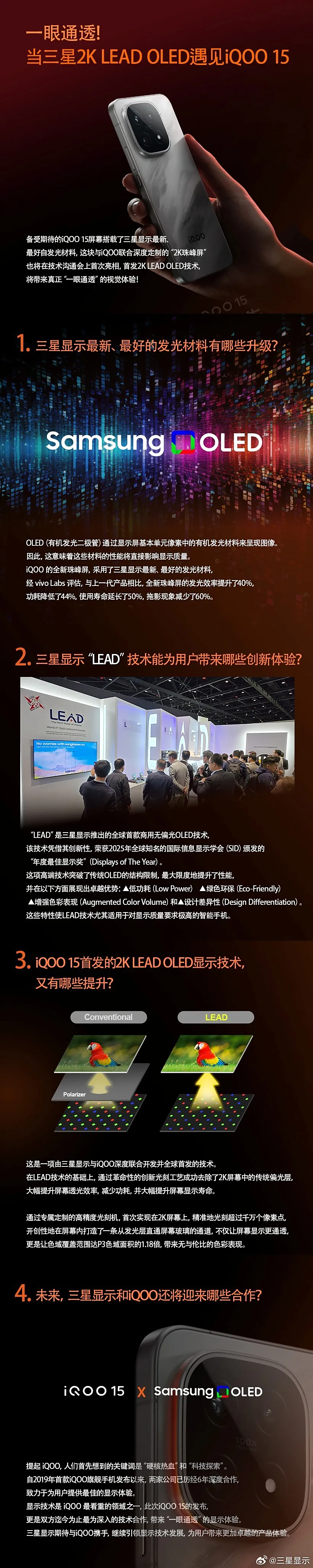 IT之家 9 月 23 日消息,三星显示官方今日发文称,全新 iQOO15 手机即将上市,搭载三星显示 2K LEAD OLED 创新技术。iQOO 手机官方转发并宣布,iQOO15 手机搭载“跨代领先的”2K 三星珠峰屏,采用了三星显示最新、最好的发光材料,并全球首发 2K LEAD OLED 显示技术。