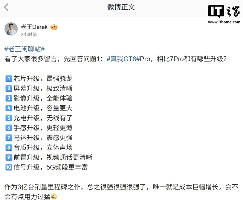 王伟表示,真我 GT8 Pro 作为 3 亿台销量里程碑之作会很强,但是成本巨幅增长。