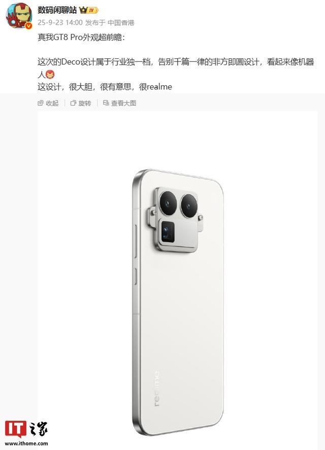 IT之家 9 月 23 日消息,博主 @数码闲聊站 今日分享了真我 GT8 Pro 手机外观。他表示,这次的 Deco 设计属于行业独一档,告别千篇一律的非方即圆设计,看起来像机器人。