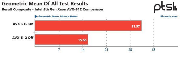 “Emerald Rapids”改善了对 AVX-512 指令集的支持,让处理器在 AVX-512 工作负载期间达到更高的频率,该媒体通过 68 项测试,对比开启和禁用 AVX-512 的性能变化。